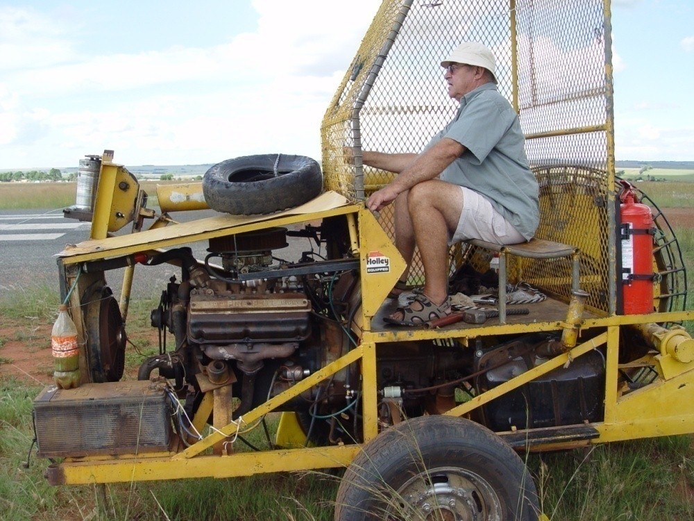 The CLub uses a launcher with a powerful De Soto Fire Flite V8 engine and a large drum with a steel cable that is two kilometers long. The launcher is put at the threshold of the airstrip and the cable pulled to the other side of the airstrip with a Nissan 1400 bakkie. It is at this point that the cable is hooked onto the glider. The launcher driver is then pulling the cable in at very high speeds with the powerful launcher engine causing the glider to climb steeply into the air. At a suitable height the glider pilot brings the glider in level flight and releases the cable. At this stage the pilot must seek out and find sitable rising air currents to take him to whatever heights he can achieve.