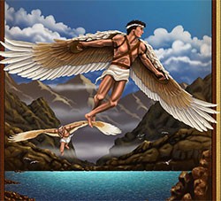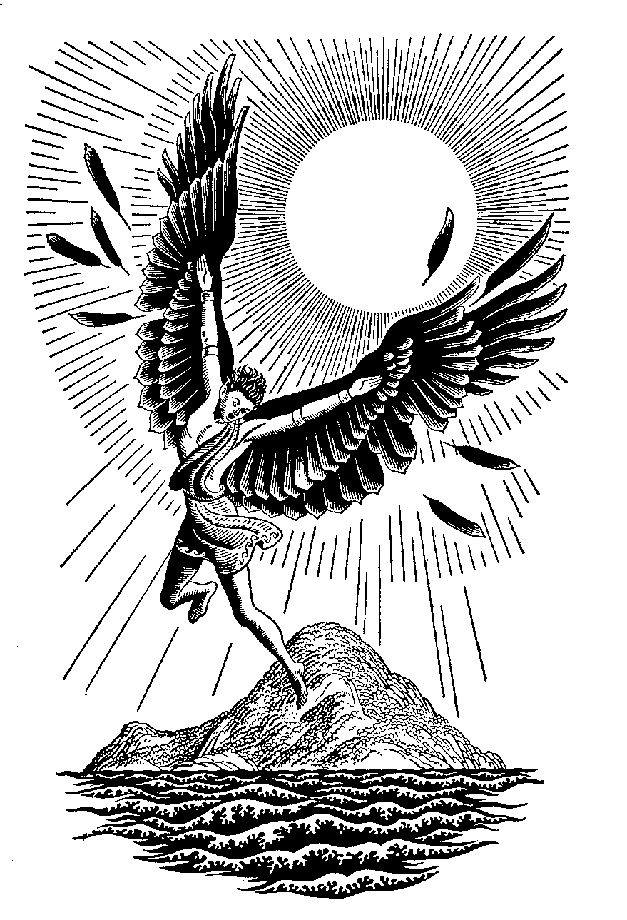 Daarmee het hy en sy seun met vlerkgeklap uit die gevangenis na vryheid die blou lug in gevlieg. Icarus het egter te naby aan die son gevlieg en die gom van sy vlerke het gesmelt, met die gevolg dat hy na sy dood geval het. Dit was die eerste vliegongluk en dood van ‘n vlieënier.