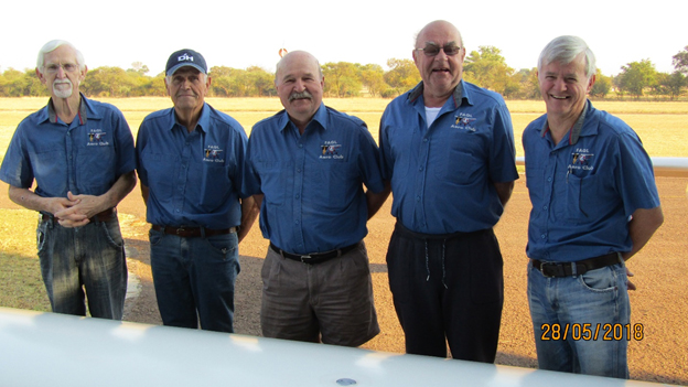 Van links, agter die vlerk van ‘n vliegtuig, is Pieter W. Nel, afgetrede privaat vlieënier wat met ‘n naggraad en veiligheidsgraad toegerus was op sy lisensie. Hy het gedurende sy vliegdae ook vliegtuie gebou en was vir ‘n paar jaar sekretaris van die Groblersdal Vliegklub. Tweede van links is René Vermeulen, wêreldbekende kommersiële oesbespuitings-vlieënier met duisende ure in sy logboeke. Hy het in baie lande in Afrika en ook oorsese lande soos Kanada oesbespuiting gedoen en kan met gesag gesels oor sy ongelooflike vliegervaring en kennis van die vliegbedryf. Derde van links is Gerhard Bachinger, veelbesproke vlieënier wat soms lagwekkende, maar ook yswekkende staaltjies uit sy vliegdae kan vertel. Vierde van links is Gerd [uitgespreek Geerd] Borchers, ‘n ervare privaat vlieënier wat ook ‘n oesbespuitings-besigheid bedryf het. Gerd is ook ‘n sweeftuig vlieënier en het tot onlangs nog sy eie sweeftuig gevlieg. Vyfde van links is Ignat du Plessis, ervare privaat vlieënier. Afgesien van die privaat gebruik van sy vliegtuig, het Ignat dit ook vir besigheid gebruik en dit uitverhuur na lande soos Nabibië, Zambië, Malawie, Tanzanië en nog ander lande. Die vyf veterane is uiters dankbaar teenoor ‘n baie aktiewe en bekawame Vliegklub Komitee oor hierdie gebaar van erkenning en welwillendheid. Dit word hoog aangeskryf en opreg waardeer om steeds deel te kan wees van een van die mees uitstaande Vliegklubs bekend.